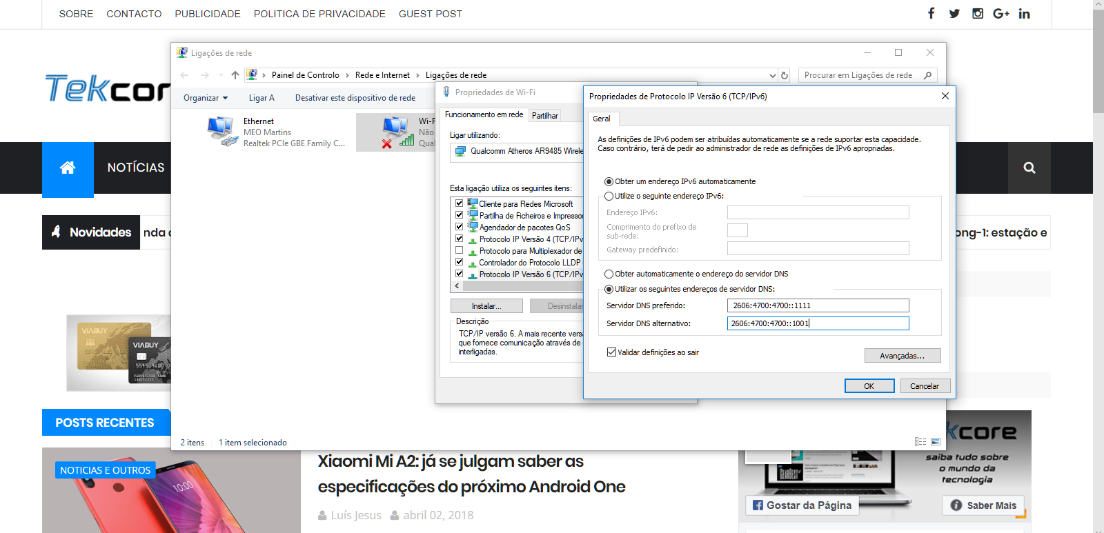 Para mudar o seu DNS basta ir às propriedades do seu adaptador Wifi ou Ethernet e clicar duas vezes sobre "Protocolo IP versão 4" e "Protocolo IP versão 6" e inserir os DNS's que pretende bem como verificar a opção "Validar definição ao sair" para as mudanças surgirem efeito sem ter de reiniciar o seu computador.